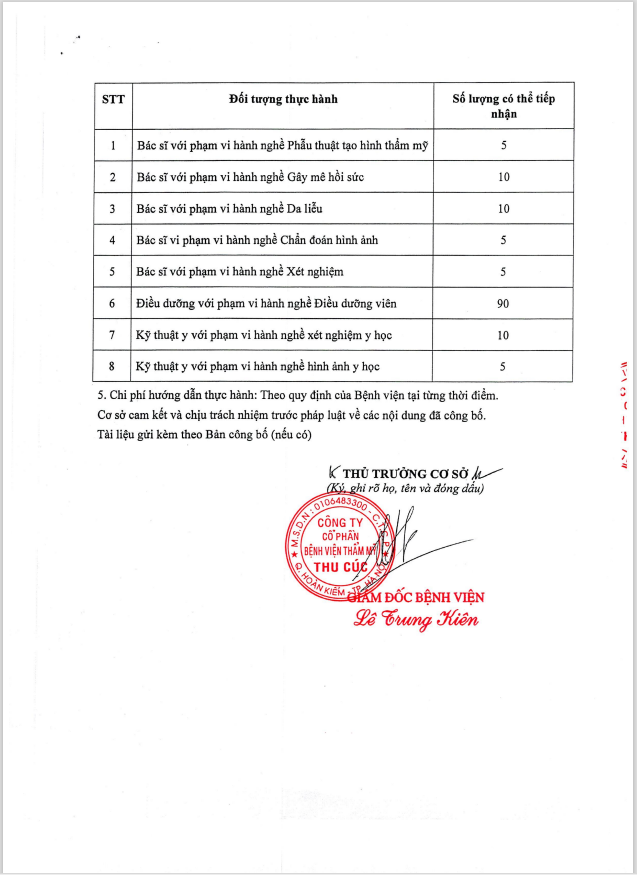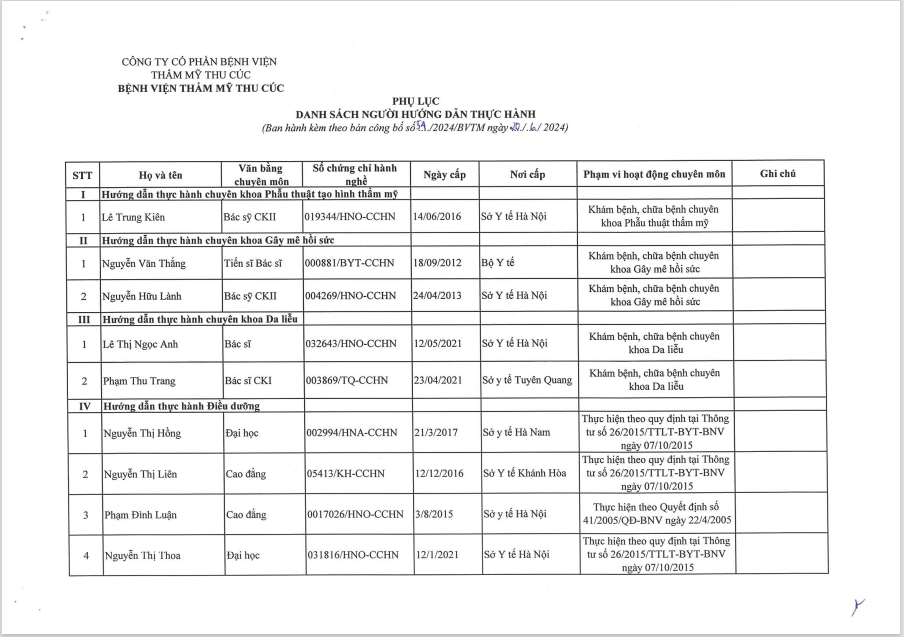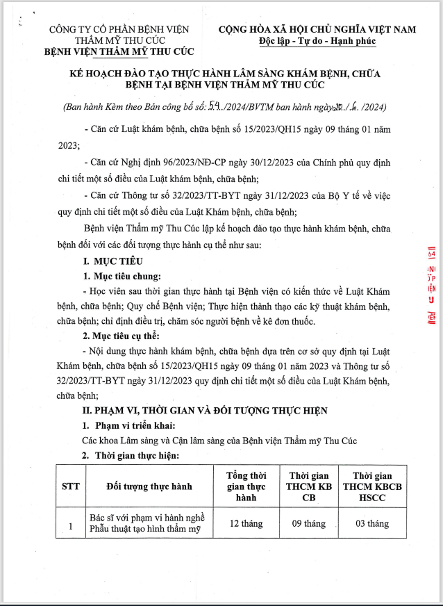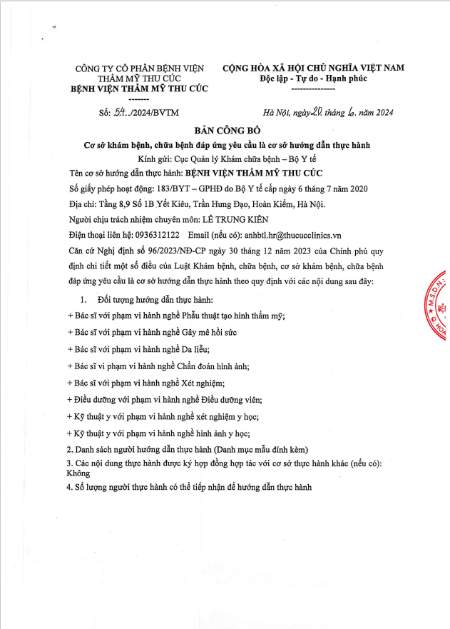 Căn cứ nghị định 96/2023/NĐ-CP ngày 30 tháng 12 năm 2023 của Chính phủ quy định chi tiết một số điều của Luật Khám bệnh, chữa bệnh, Bệnh viện Thẩm mỹ Thu Cúc đăng tải bản công bố cơ sở khám bệnh, chữa bệnh đáp ứng yêu cầu là cơ sở hướng dẫn thực hành số 54/2024/BVTM ngày 20/6/2024.