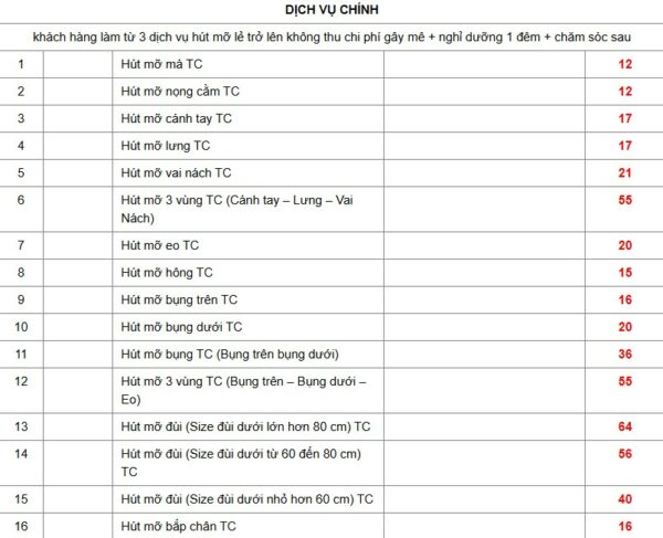 Bảng giá hút mỡ tham khảo tại Bệnh viện Thẩm mỹ Thu Cúc. Đơn vị: Triệu đồng